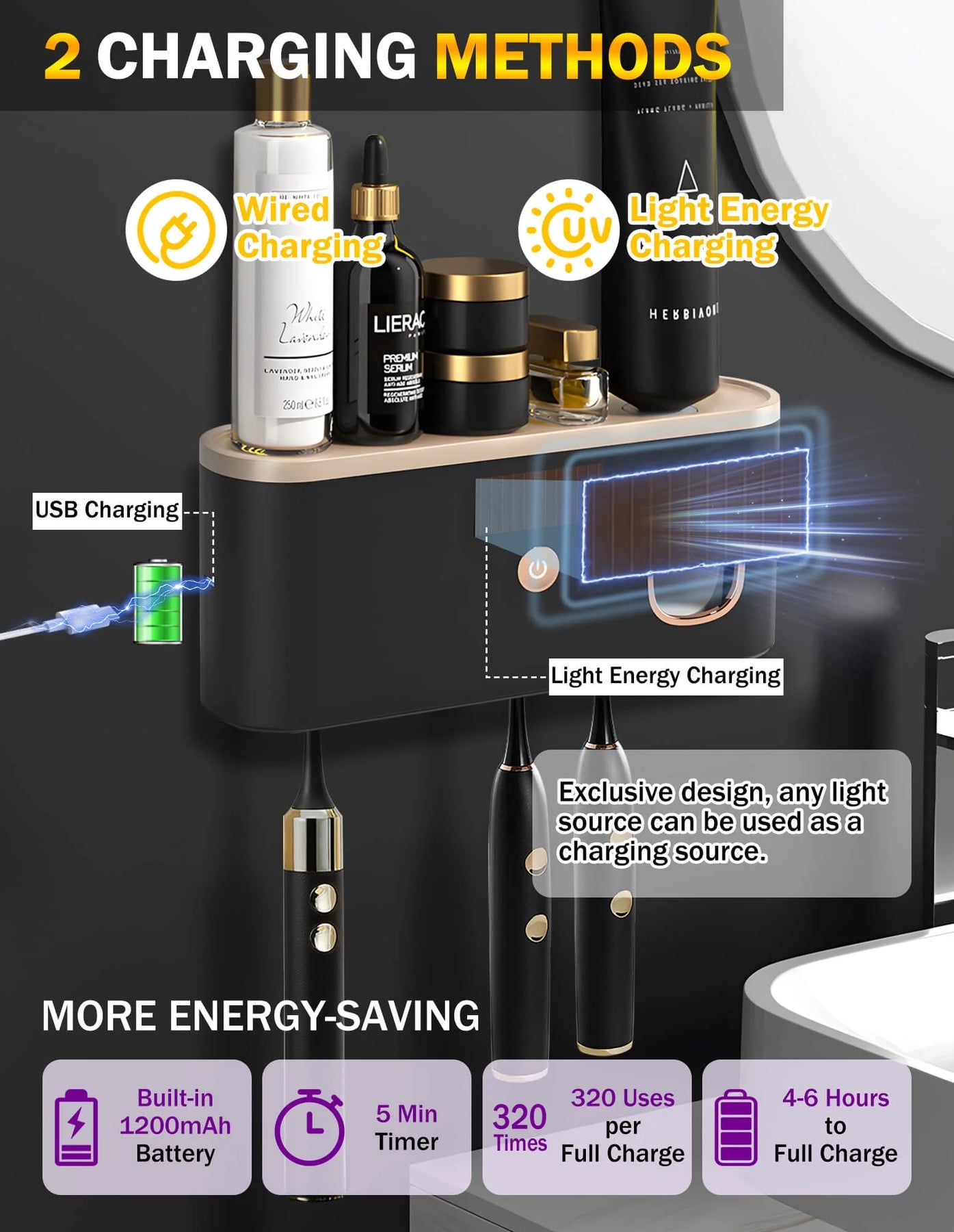 Powered by innovative light energy (any light source, including lights), our bathroom toothbrush holder set doesn't need to be connected to an electrical source all the time. It's more eco-friendly and hassle-free. Of course, our toothbrush holders for bathrooms also support USB fast charging, providing you with the greatest convenience with two charging methods.